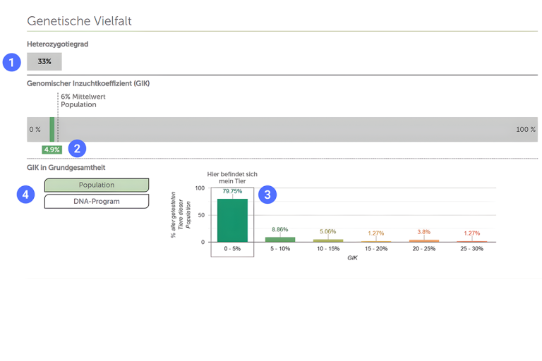 - Der genomische Inzuchtkoeffizient wird ebenfalls als Prozentwert innerhalb eines farbigen Balkens angezeigt. Die Farbe und Länge des Balkens geben Aufschluss über den Grad der Inzucht. Ein grüner Balken deutet auf einen geringen Wert hin, während ein roter Balken auf einen höheren Wert hinweist. Eine gestrichelte Linie zeigt den aktuellen mittleren Inzuchtwert der untersuchten Tiere der betreffenden Population an.